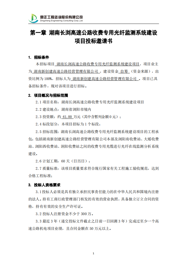 湖南長瀏高速公路收費(fèi)專用光纖監(jiān)測系統(tǒng)建設(shè)項(xiàng)目投標(biāo)邀請書