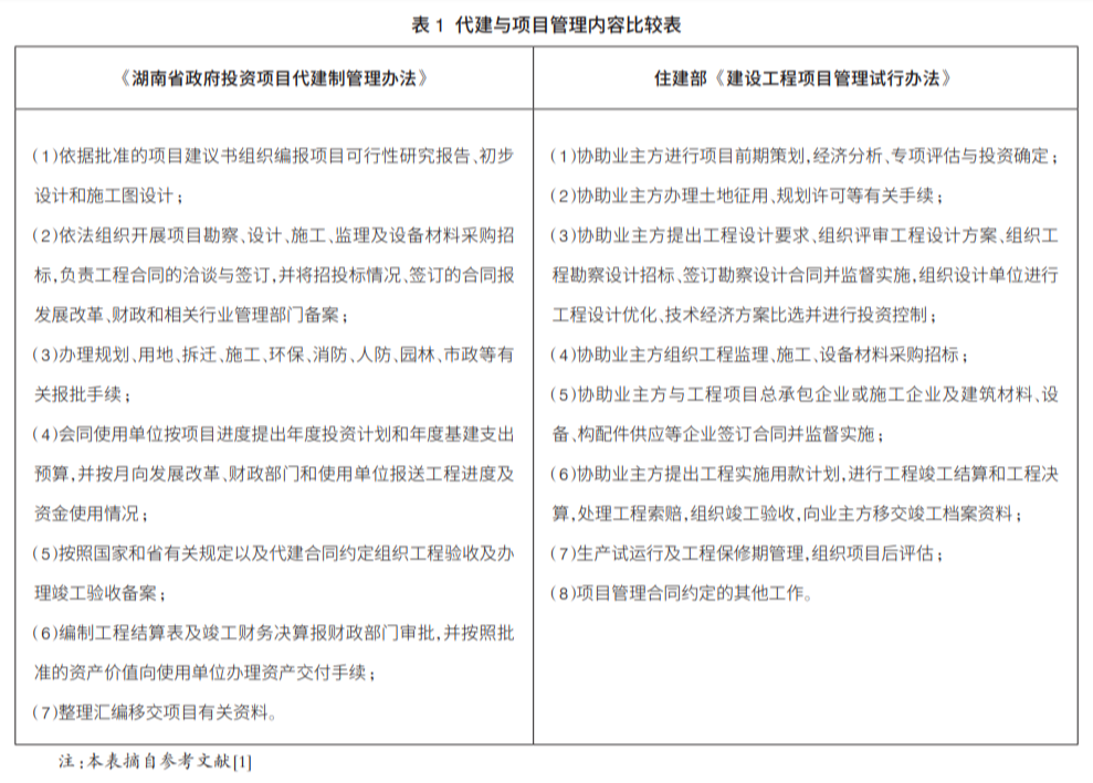 為貫徹2004年國務院發(fā)布的《關于投資體制改革的決定》精神,我國非經(jīng)營性政府投資項目已逐步形成了“政府專業(yè)機構代建、政府專業(yè)代建公司代建和社會代建單位代建”三種主要模式。2007年,湖南省對社會代建項目作出明確規(guī)定,代建服務的業(yè)主包含政府職能部門和項目使用方,體現(xiàn)了政府職能部門(發(fā)改和財政等部門)對非經(jīng)營性政府投資項目的監(jiān)管,而且是可考核的工作。2007年住建部發(fā)布的《建設工程項目管理試行辦法》明確了為業(yè)主服務的項目管理內容(表1),是以“協(xié)助”為主的服務,這在當時為推進我國項目管理發(fā)展是必要的。目前,從效果考核的角度看,除了有部分是代理業(yè)主履行并可考核的工作外,大多的“協(xié)助”工作涉及到與業(yè)主的相互配合,服務效果難以考核。不能考核的工作要想得到業(yè)主和社會的認可是困難的,這也是截至目前無法出臺全國性的工程項目管理服務酬金標準的原因之一。