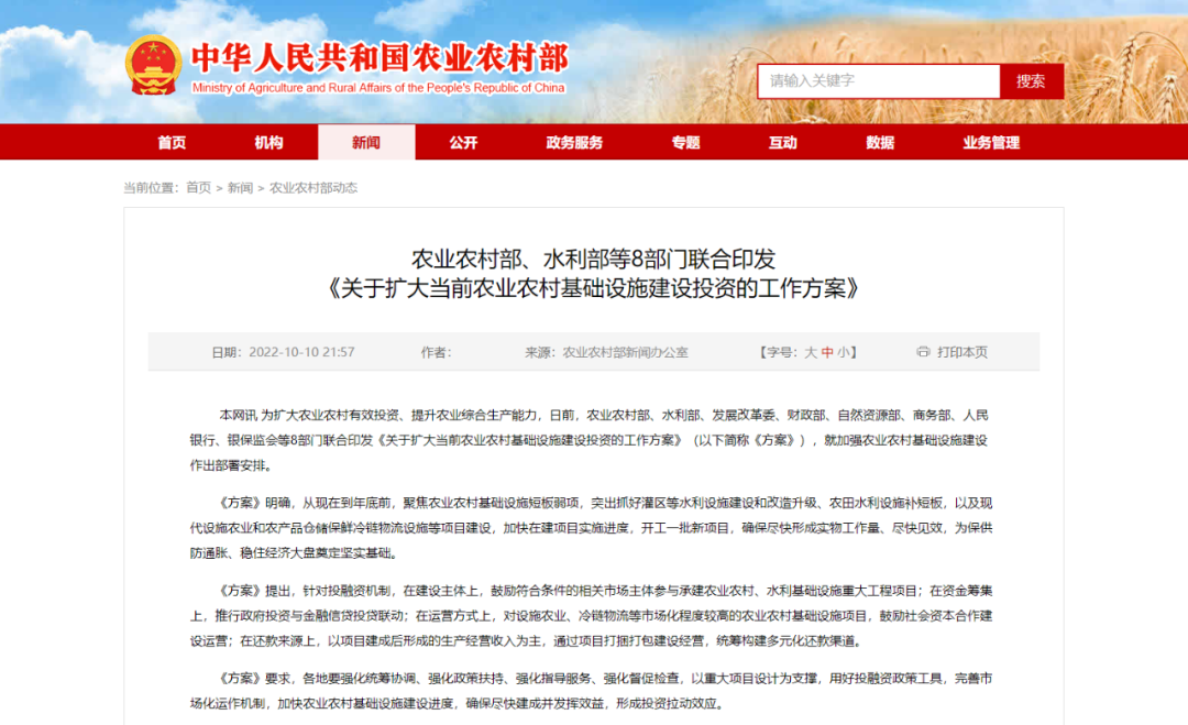 為擴(kuò)大農(nóng)業(yè)農(nóng)村有效投資、提升農(nóng)業(yè)綜合生產(chǎn)能力,日前,農(nóng)業(yè)農(nóng)村部、水利部、發(fā)展改革委、財(cái)政部、自然資源部、商務(wù)部、人民銀行、銀保監(jiān)會(huì)等8部門聯(lián)合印發(fā)《關(guān)于擴(kuò)大當(dāng)前農(nóng)業(yè)農(nóng)村基礎(chǔ)設(shè)施建設(shè)投資的工作方案》(以下簡稱《方案》),就加強(qiáng)農(nóng)業(yè)農(nóng)村基礎(chǔ)設(shè)施建設(shè)作出部署安排。