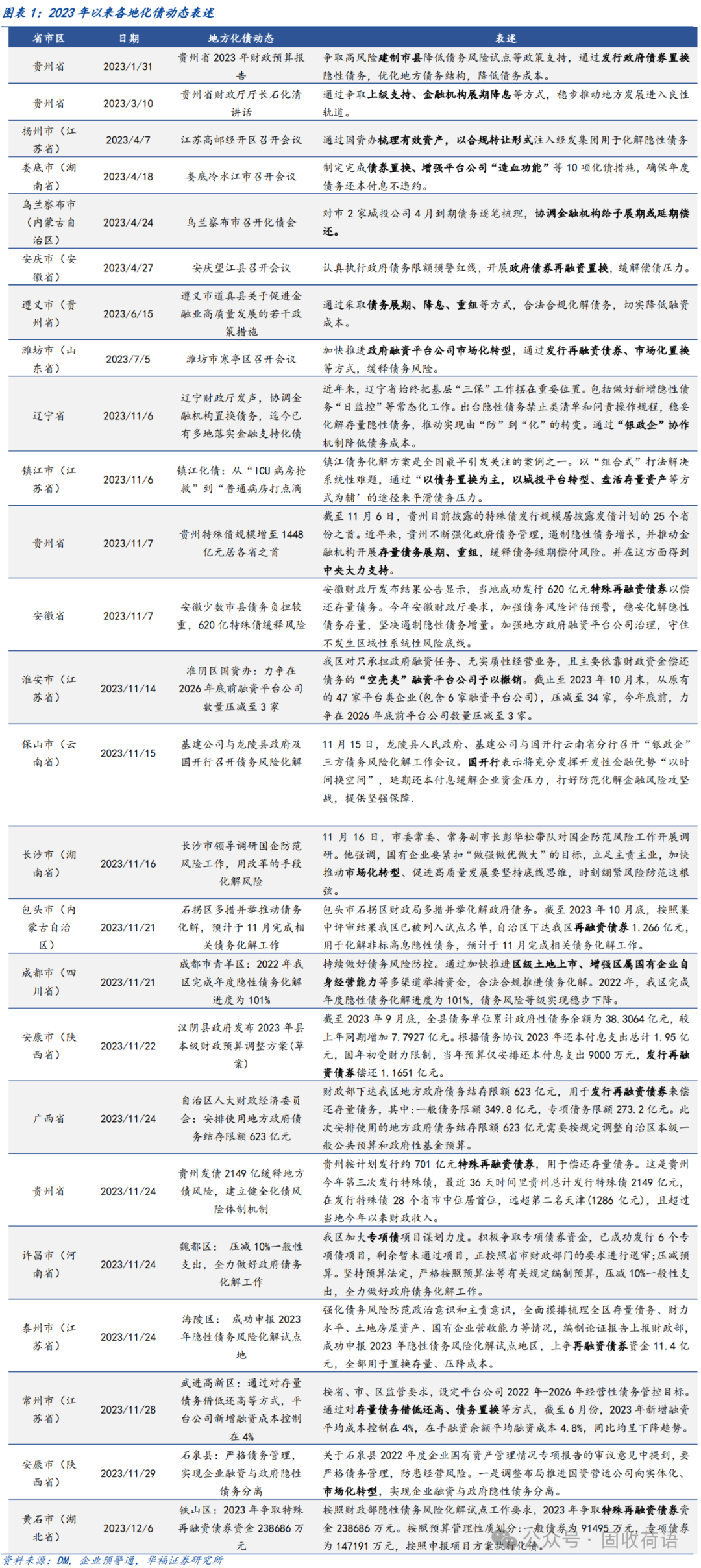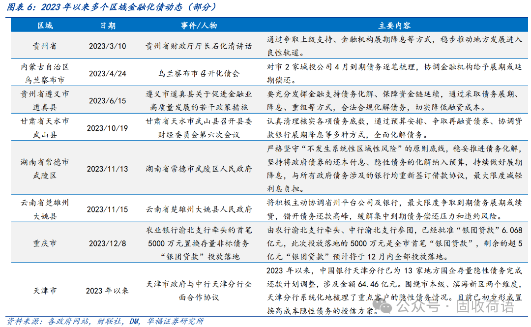 財政部《地方全口徑債務清查統(tǒng)計填報說明》中提出六種常見的債務化解舉措,具體為(1)安排財政資金償還;(2)出讓政府股權以及經(jīng)營性國有資產(chǎn)權益償還;(3)利用項目結轉資金、經(jīng)營收入償還;(4)合規(guī)轉化為企業(yè)經(jīng)營性債務;(5)通過借新還舊、展期等方式償還;(6)采取破產(chǎn)重整或清算方式化解。同時,根據(jù)各地化債動態(tài)表述,各地根據(jù)自身情況,積極探索了金融機構貸款置換、城投平臺整合或轉型、特殊再融資債置換、設立化債基金等方式推動化債進程。