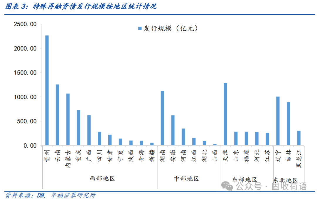 發(fā)行集中在西部地區(qū)。相較于東、中部地區(qū),西部地區(qū)整體綜合財力較弱,債務負擔較重,因此在上級支持方面存在較大優(yōu)勢。