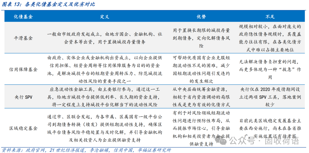 設立“化債基金”作為地方政府有效的管控城投債務風險的手段,被各地廣泛運用,包括平滑基金、信用保障基金、央行SPV等。基金資金主要來源于省內(nèi)/市內(nèi),調動的是區(qū)域內(nèi)的金融資源,但規(guī)模相對有限;SPV在投放貸款的同時或要求抵押品,因此國有資源更為豐富的區(qū)域預計將獲得更大的支持。