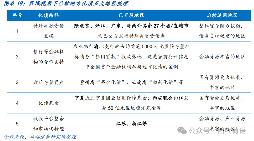 因此,根據(jù)政策和實踐,目前化債手段可以歸納以下幾類,分別為特殊再融資債置換、銀行等金融機構的合作支持、盤活存量資產(chǎn)、化債基金、城投平臺加速整合與市場化轉型。