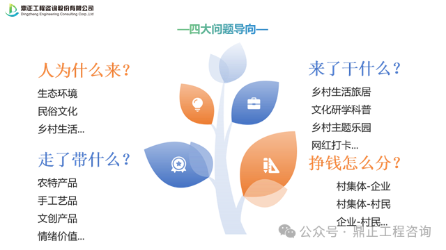 圍繞人為什么來、來了干什么、走了帶什么、掙錢怎么分四大問題去思考鄉(xiāng)村該怎么運(yùn)營(yíng),去明確鄉(xiāng)村的主題定位、發(fā)展方向、核心產(chǎn)品、運(yùn)營(yíng)方式,更好地推進(jìn)鄉(xiāng)村運(yùn)營(yíng)。
