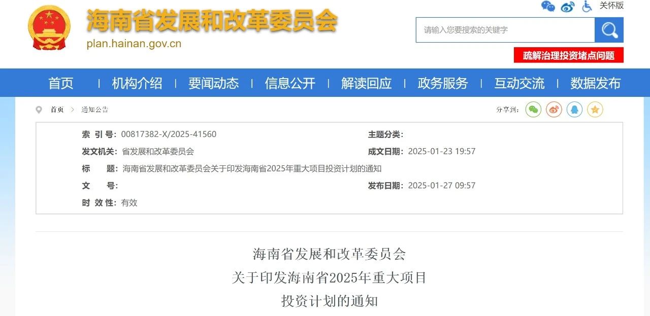 海南省發(fā)展改革委公布《海南省2025年重大項目投資計劃》。2025年安排省重大正式項目554個,總投資8540億元,年度計劃投資1647億元。其中,竣工項目121個、續(xù)建項目274個、新開工項目159個。此外,安排省級145個預(yù)備項目,總投資2485億元。