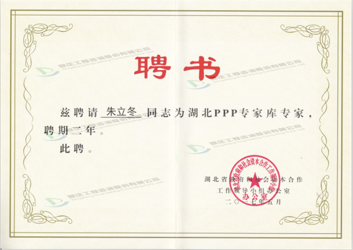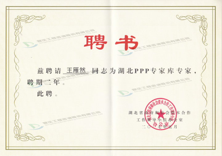近日,湖北省政府和社會資本合作工作領(lǐng)導(dǎo)小組辦公室授予鼎正公司董事長王雁然先生、副總經(jīng)理兼技術(shù)總監(jiān)朱立冬教授為湖北省PPP專家?guī)鞂<摇4饲?/SPAN>,我司王雁然先生、朱立冬教授、張宏亮先生已入選湖北省財(cái)政廳PPP專家?guī)鞂<?,另外,王雁然先生還被崇陽縣人民政府聘為崇陽縣PPP項(xiàng)目專家顧問。