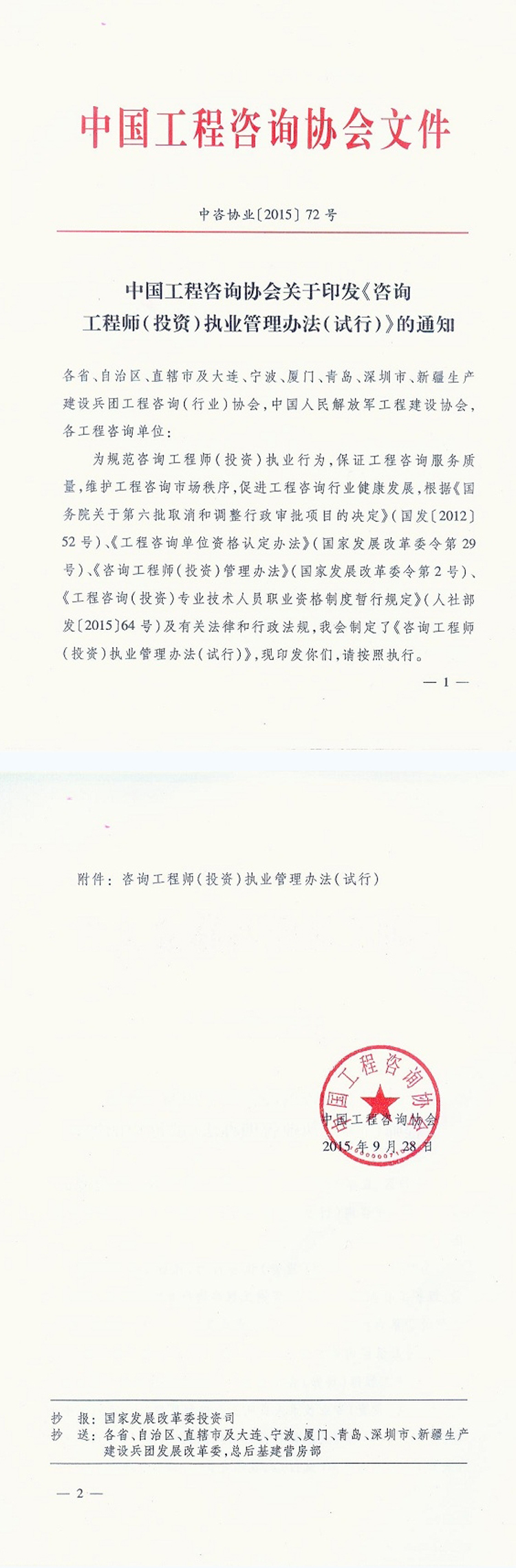 第四條  中國工程咨詢協會(以下簡稱“中咨協會”)是全國工程咨詢行業的自律組織,負責管理咨詢工程師(投資)及工程咨詢單位與咨詢工程師(投資)相關事項的執業行為。