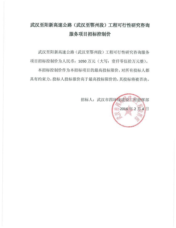 武漢至陽新高速公路(武漢至鄂州段)工程可行性研究咨詢服務項目招標控制價